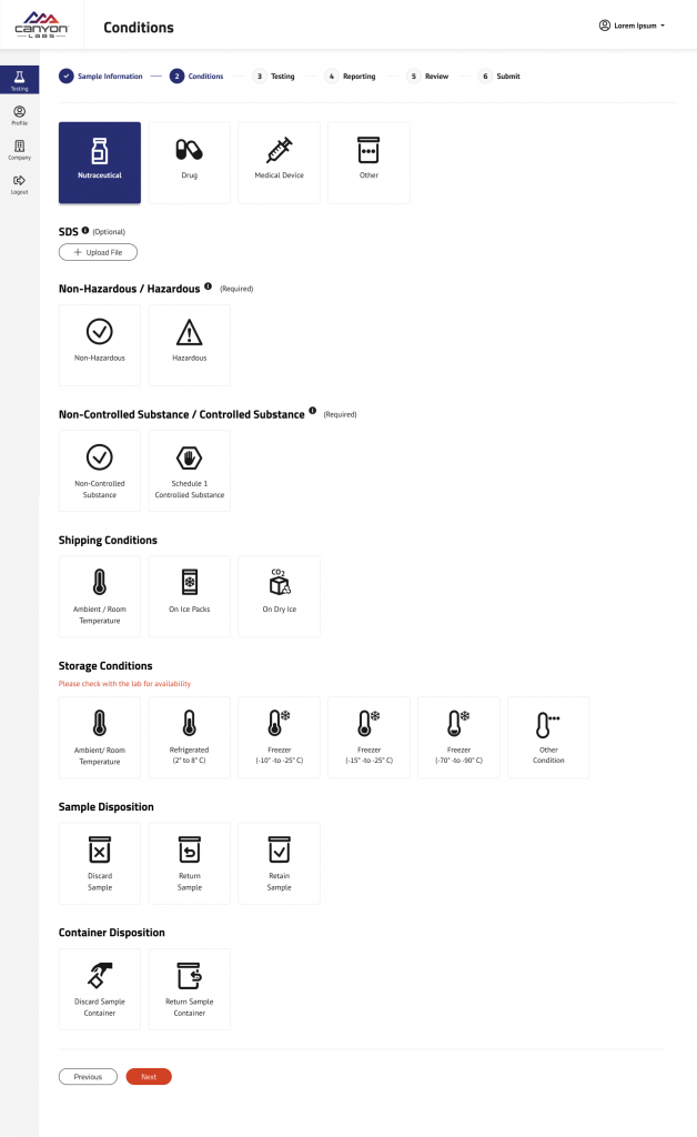 Along with the project manager, I helped to conduct user tests. We asked individuals to walk us through how they would conduct tasks like submitting new samples for testing, looking for sample testing results, and manage account information. Based on the feedback we received, the design went through multiple rounds of iteration. We added trimmed down sections of the process that were cumbersome and added new features base don users suggestions. For example,