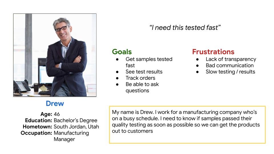 Our first step was to better understand user’s needs and project requirements. I assisted the project manager with conducting user interviews. We spoke with company executives, the sample receiving team, lab testing personnel, and customers.